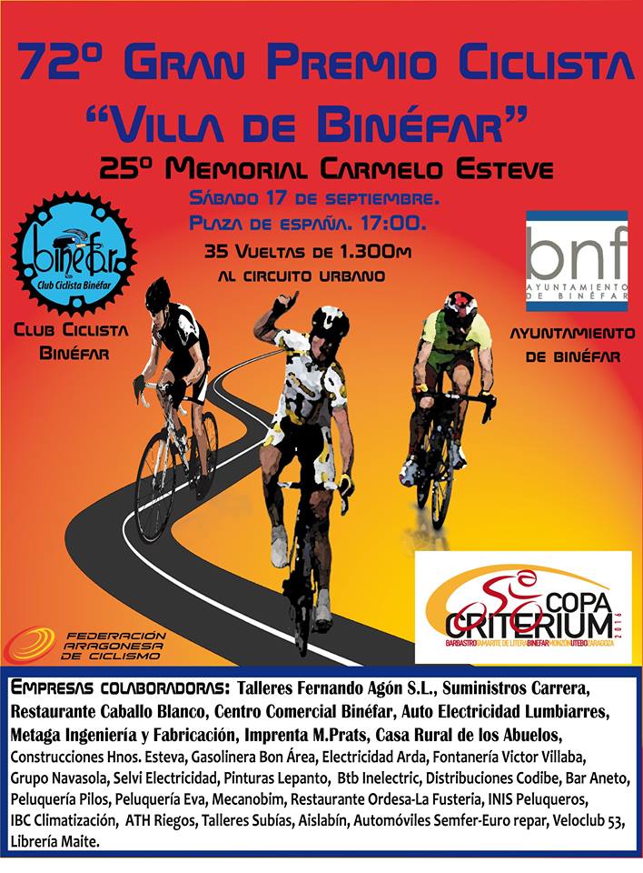 El sábado 17 de septiembre llega la Copa Criterium a Binéfar. A las 17:00 h dará comienzo el 72º «Gran premio ciclista villa de Binéfar» y 25º «Memorial Carmelo Esteve«.